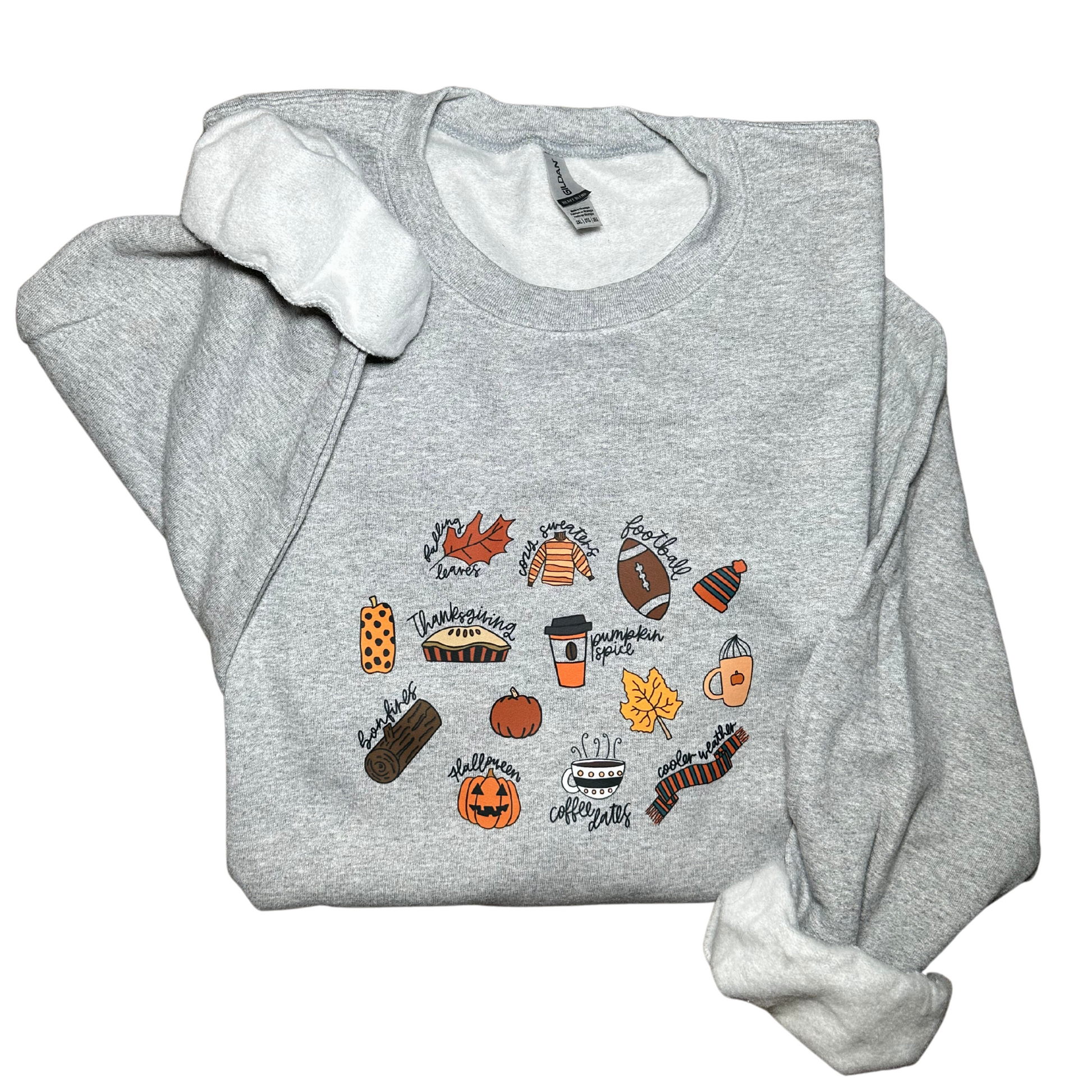 Grey crewneck with fall things.